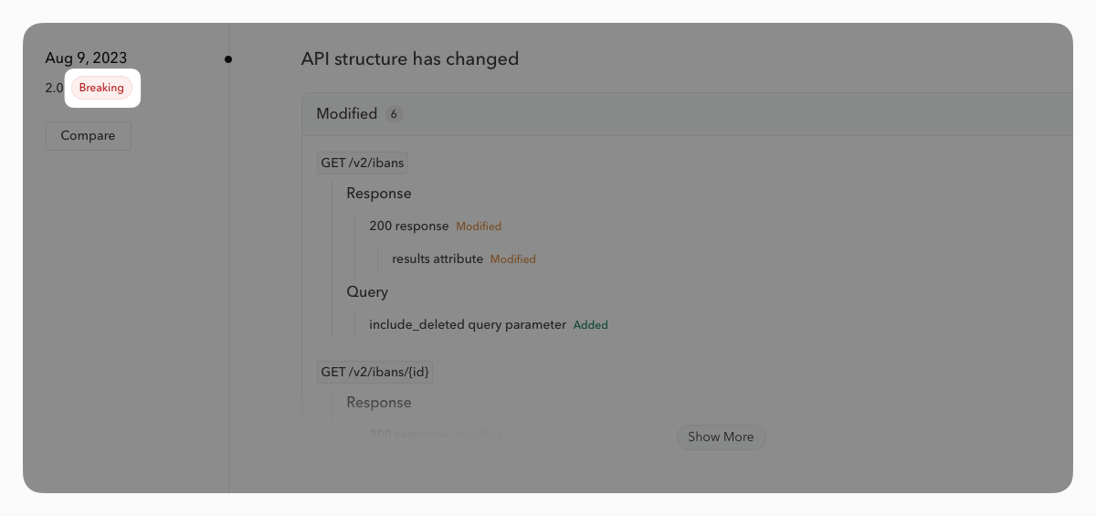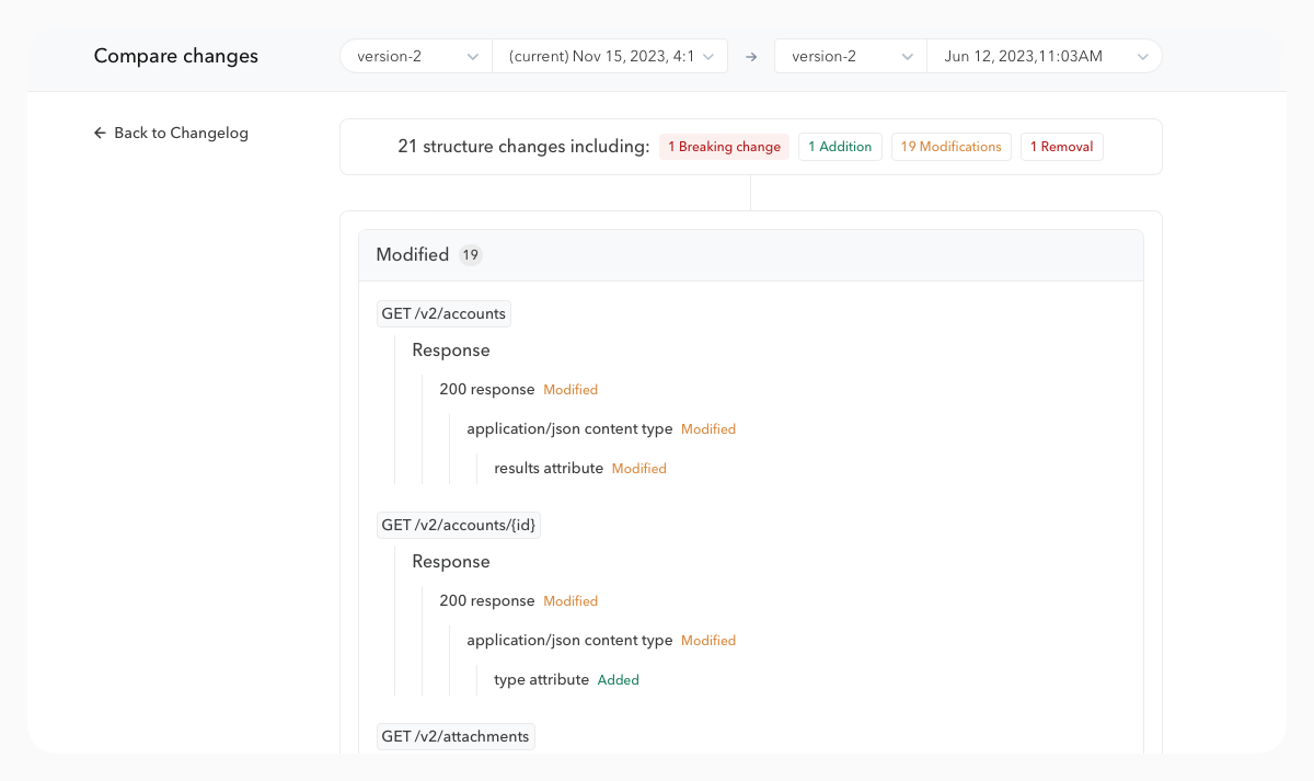 With each new release of an API document, the changelog is automatically updated to inform your API consumers of every change. You can also add context during a release or later.