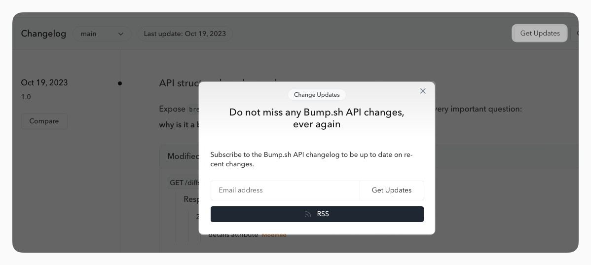 Your API consumers can subscribe to a weekly summary of changes to your API via email by clicking on Get Updates from the changelog page.